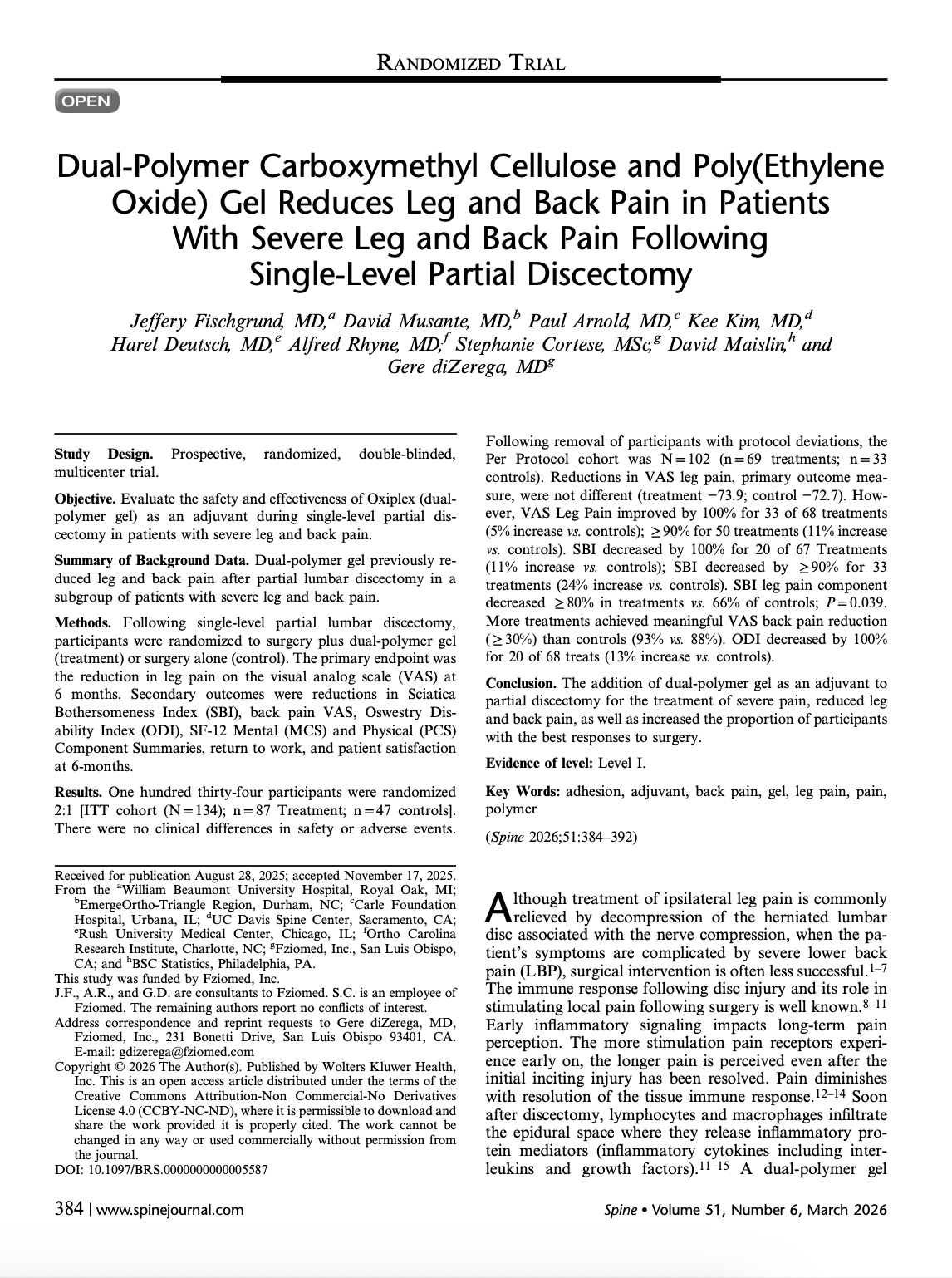 Dual-Polymer Carboxymethyl Cellulose and Poly(Ethylene Oxide) Gel Reduces Leg and Back Pain in Patients with Severe Leg and Back Pain Following Single Level Partial Discectomy. Spine 2026, Fischgrund et al.