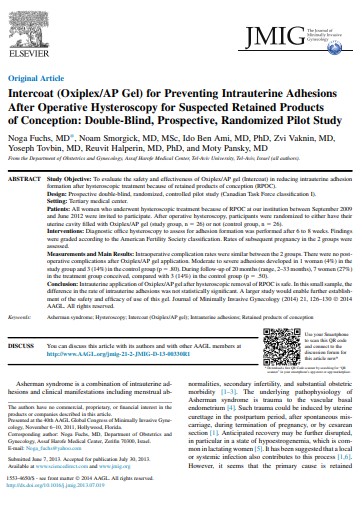Intercoat for preventing intrauterine adhesions after operative hysteroscopy for suspected retained products of conception: double-blind, prospective, randomized pilot study. J Minim Invasive Gynecol 2014, Fuchs et al.