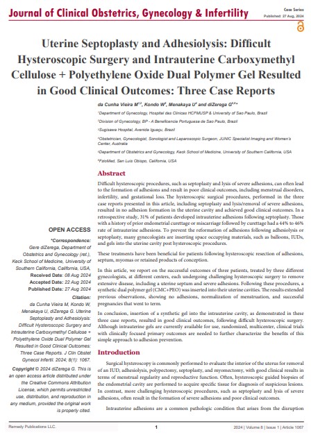 Uterine Septoplasty and Adhesiolysis: Difficult Hysteroscopic Surgery and Intrauterine CMC + PEO Dual Polymer Gel Resulted in Good Clinical Outcomes: Three Case Reports. J of Clin Obst Gyn & Infert 2024, da Cunha Vieira et al.