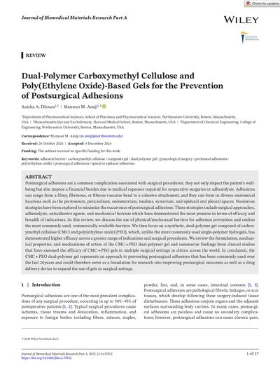 Dual-Polymer Carboxymethyl Cellulose and Poly(Ethylene Oxide) Based Gels for the Prevention of Postsurgical Adhesions. J Biomed Mater Res 2025, DSouza et al.