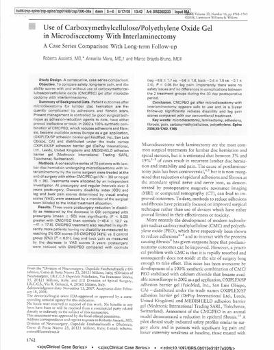 Use of CMC/PEO gel in microdiscectomy with interlaminectomy: a case series comparison with long-term follow-up. Spine 2008, Assietti et al.