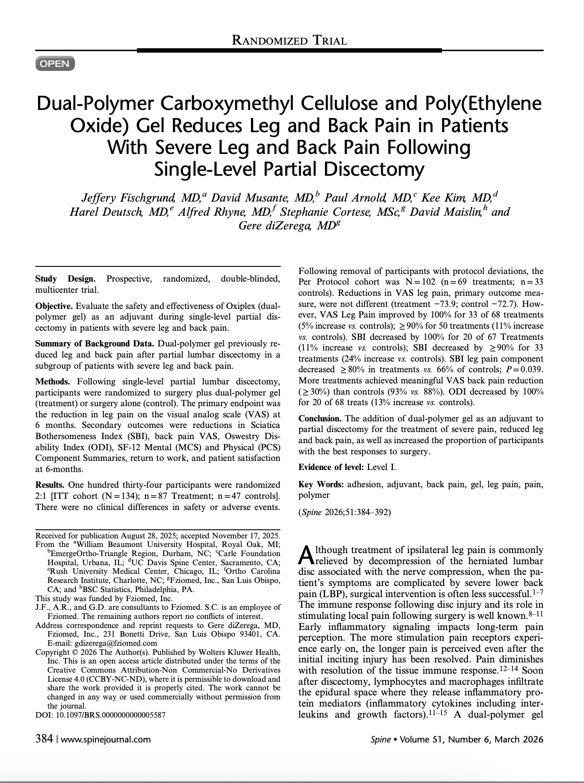 Dual-Polymer Carboxymethyl Cellulose and Poly(Ethylene Oxide) Gel Reduces Leg and Back Pain in Patients with Severe Leg and Back Pain Following Single Level Partial Discectomy. Spine 2026, Fischgrund et al.
