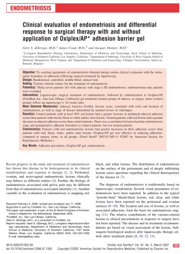 Clinical evaluation of endometriosis and differential response to surgical therapy with and without Oxiplex/AP adhesion barrier gel. Fertility and Sterility 2007, diZerega et al.