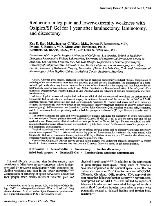 Reduction in leg pain and lower-extremity weakness for 1 year with Oxiplex/SP Gel following laminectomy, laminotomy, and discectomy. Neurosurg Focus 2004, Kim et al.
